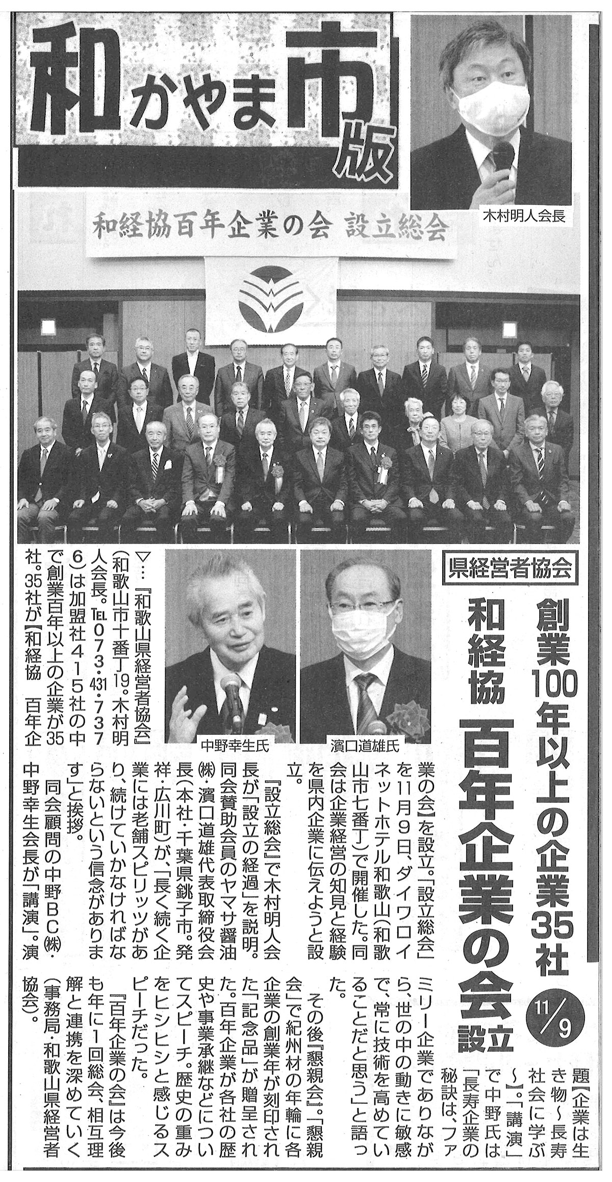 「和歌山特報」に百年企業の会の記事が掲載されました。 2021年11月21日発行の和歌山特報に和歌山経営協会「百年企業の会」設立(既報)についての記事が掲載されました。 「和歌山特報」2021年11月21日
