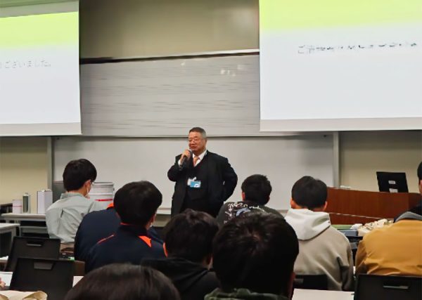 本講座は、同校が学生の就職観の醸成等を目的として、県内有力企業を招いて、会社の実状、講師の体験談等の講義を行うもので、当社は今年度最後の会社として招待されたものです。